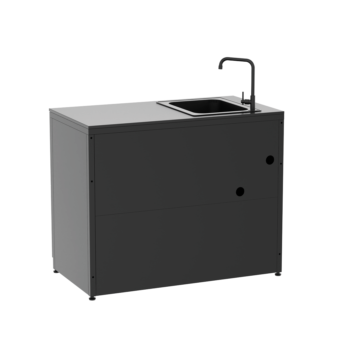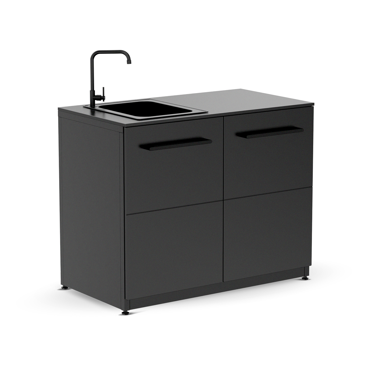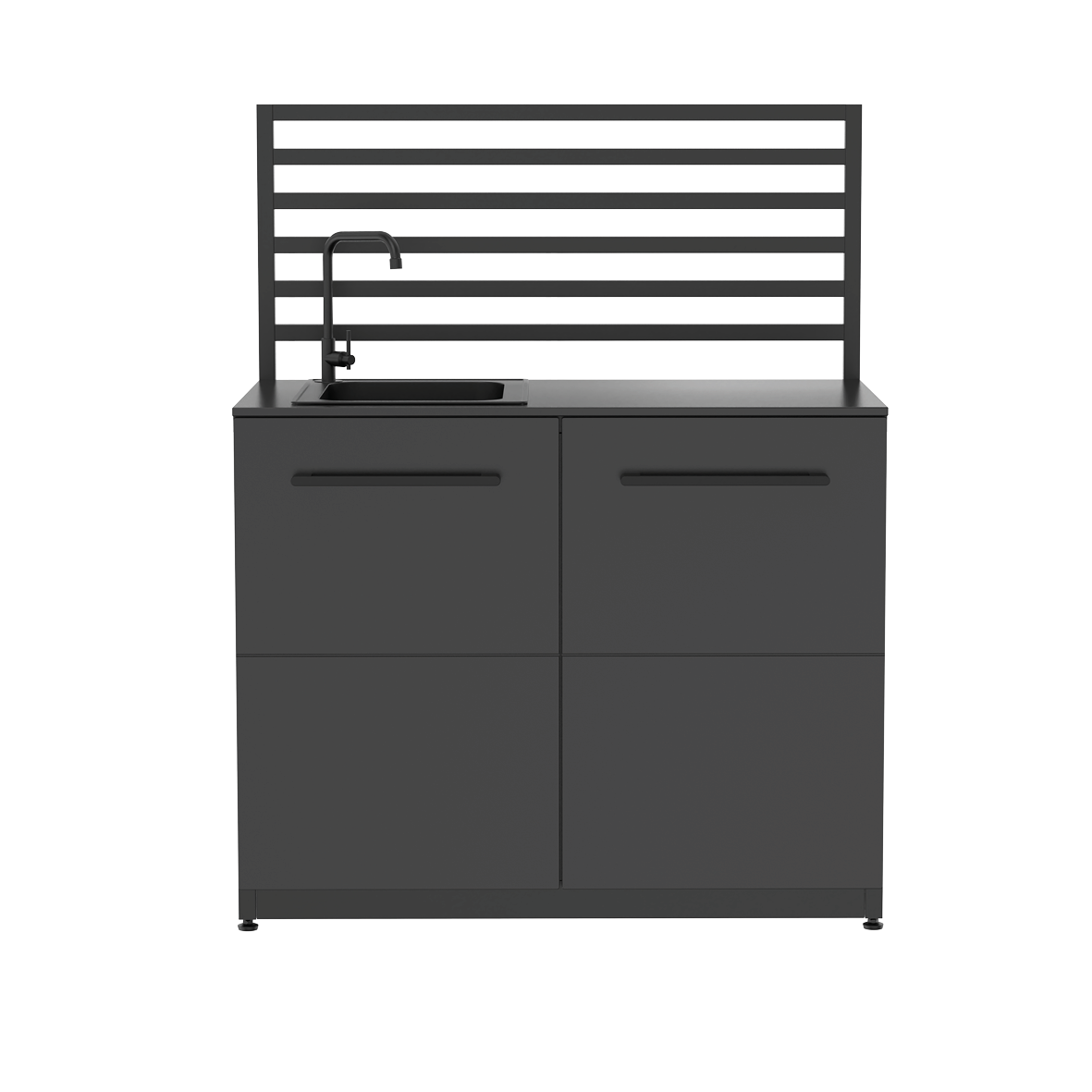 Durch die verstellbaren Beine steht die Cozze Elements Küche auf nahezu jeder Oberfläche absolut waagerecht – ideal für den Einsatz auf Terrassen, im Garten oder auf unebenen Böden. Ihr verzinkter und mattschwarz pulverbeschichteter Korpus verleiht der Küche nicht nur eine edle Optik, sondern schützt sie auch zuverlässig vor Witterungseinflüssen. Die Hochdrucklaminat-Türen und Aluminiumgriffe unterstreichen die Langlebigkeit und das zeitlose Design des Moduls.