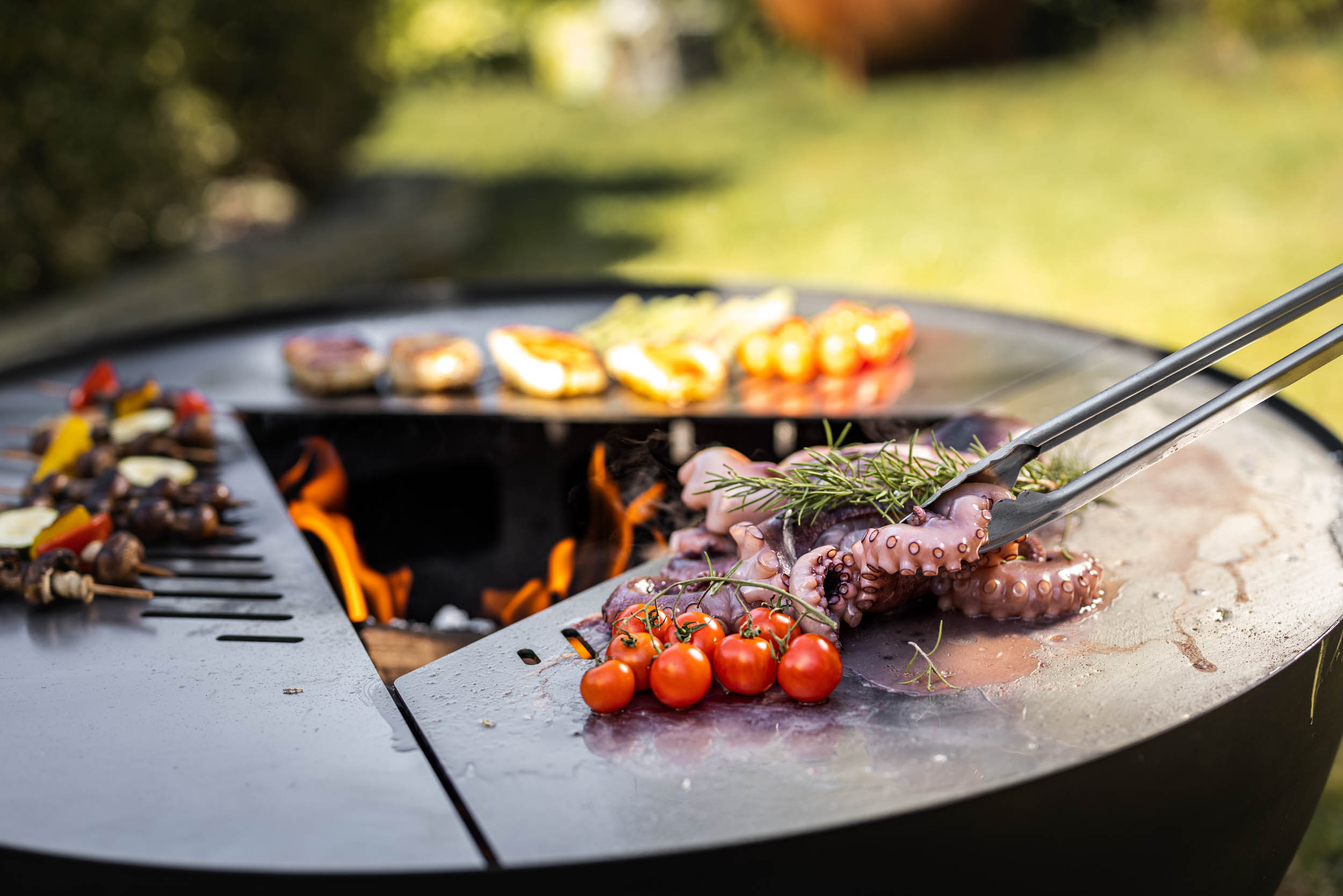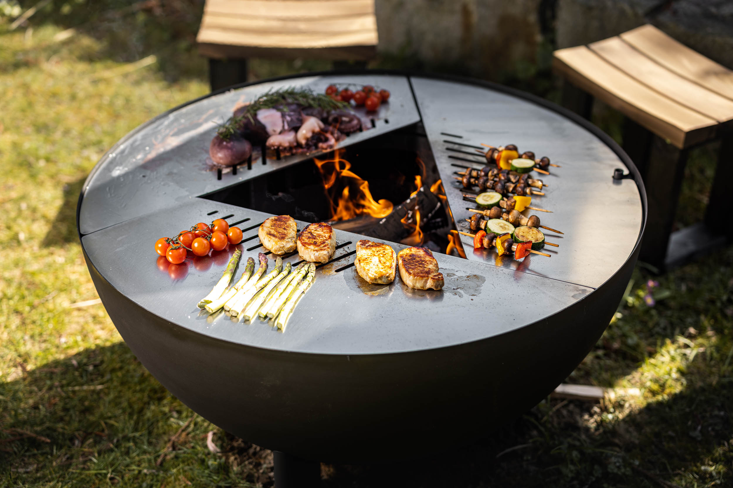 Sie lieben lange gemütliche Grillabende und das knisternde Feuer? Mit der Feuerschale Feu du Jardin TRIA lässt sich beides ganz einfach kombinieren. Im Fokus steht das offene Feuer in der Mitte der Feuerschale. Mit den drei hochwertigen Edelstahlplatten und/oder einem separat erhältlichen Grillrost können außerdem ganz einfach Gerichte mit Fleisch, Fisch und Gemüse gegrillt werden. Auf den flachen Platten lassen sich beispielsweise Spiegeleier ebenfalls leicht zubereiten.