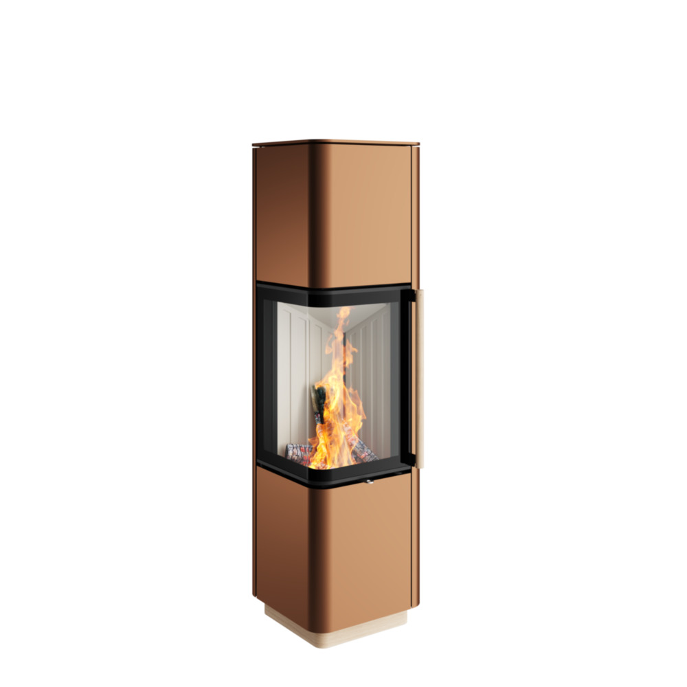 Die markante Eckform mit abgerundeten Kanten und die modernen Holzdetails an Griff und Sockel verleihen diesem Schwedenofen eine einzigartige Ausstrahlung. Die großzügige Ecksichtscheibe ermöglicht einen unverstellten Blick auf das faszinierende Flammenspiel.