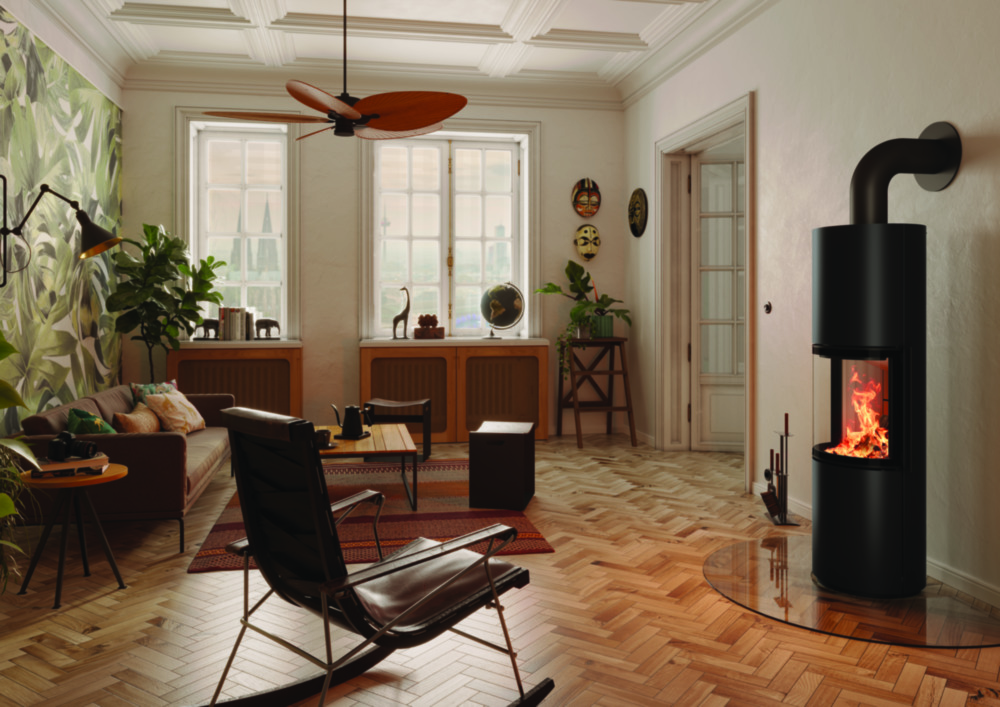 Der Passo Kaminofen von Spartherm ist ein besonderes Highlight für jedes Wohnzimmer. Durch sein kreisrundes Design und die große Panoramascheibe bietet er eine atemberaubende Sicht auf das Feuer. Die schnörkellose Form des Ofens und die klappbare Glastür, die eine 180-Grad-Sicht auf das Feuer ermöglicht, verleihen dem Raum eine zeitlose Eleganz.