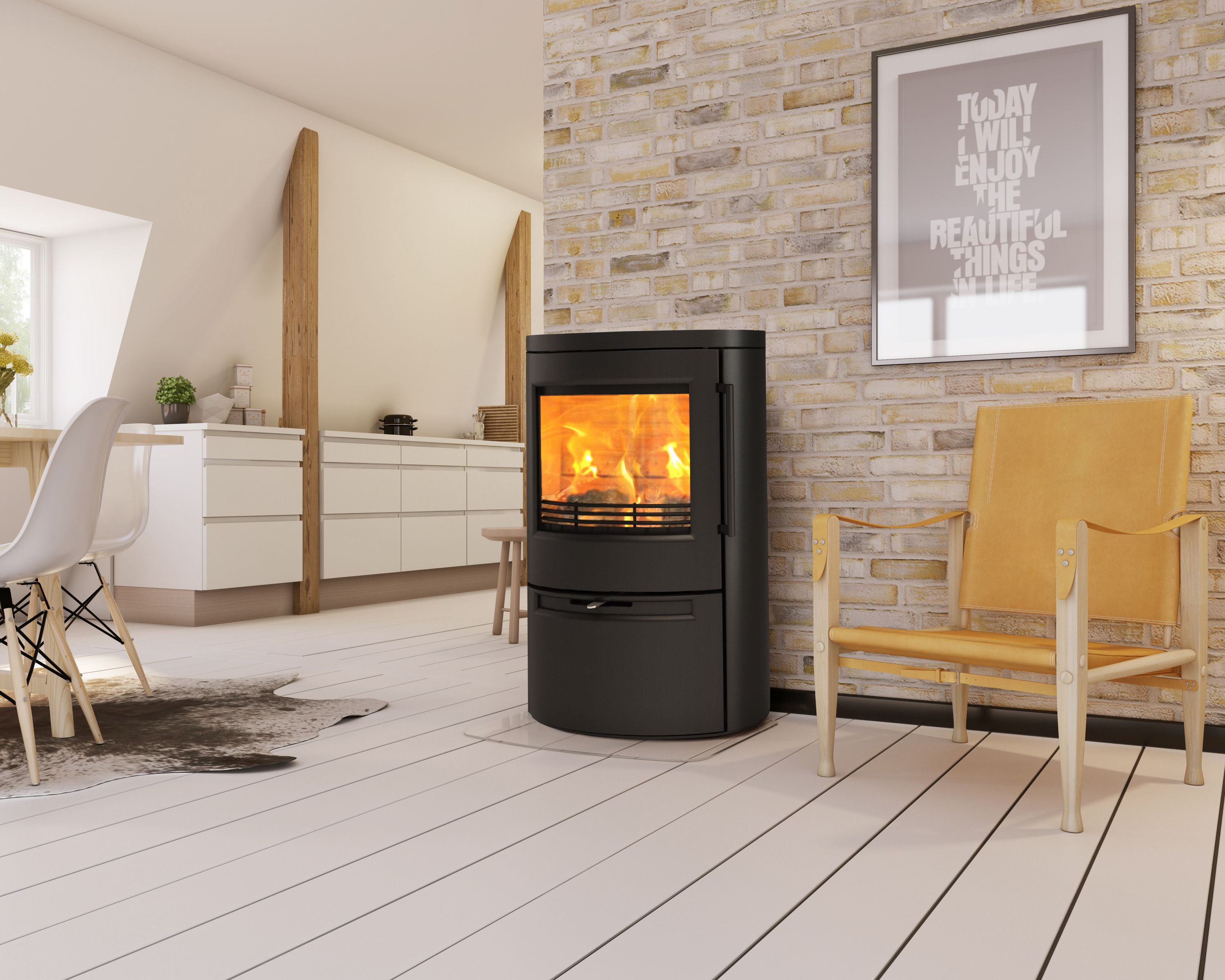 Der TT55R besticht durch seine runde Formgebung und die großzügige Sichtscheibe, die einen nahezu ungestörten Blick auf die Flammen ermöglicht. Der magnetische Schließmechanismus sorgt für eine besonders komfortable und sichere Bedienung, während die Tür zum Holzfach bereits für das optionale Kaminbesteck vorbereitet ist – so bleibt alles ordentlich und griffbereit.