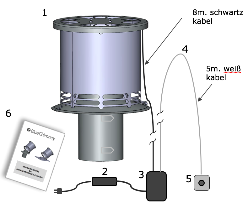 Dank der integrierten Regenkappenfunktion bleibt Ihr Schornstein auch bei Regen trocken – das schützt die Anlage vor Feuchtigkeit und verlängert ihre Lebensdauer. Der eingebaute 24V-Niedervoltmotor stammt von einem der weltweit führenden Hersteller und bietet eine hohe Betriebssicherheit bei gleichzeitig sehr leisem Lauf. Die Stromversorgung erfolgt einfach über eine Steckdose – im Dachgeschoss, im Freien oder im Innenraum. Dadurch kann der BlueChimney ganz unkompliziert angeschlossen werden, ohne dass ein Elektriker erforderlich ist.